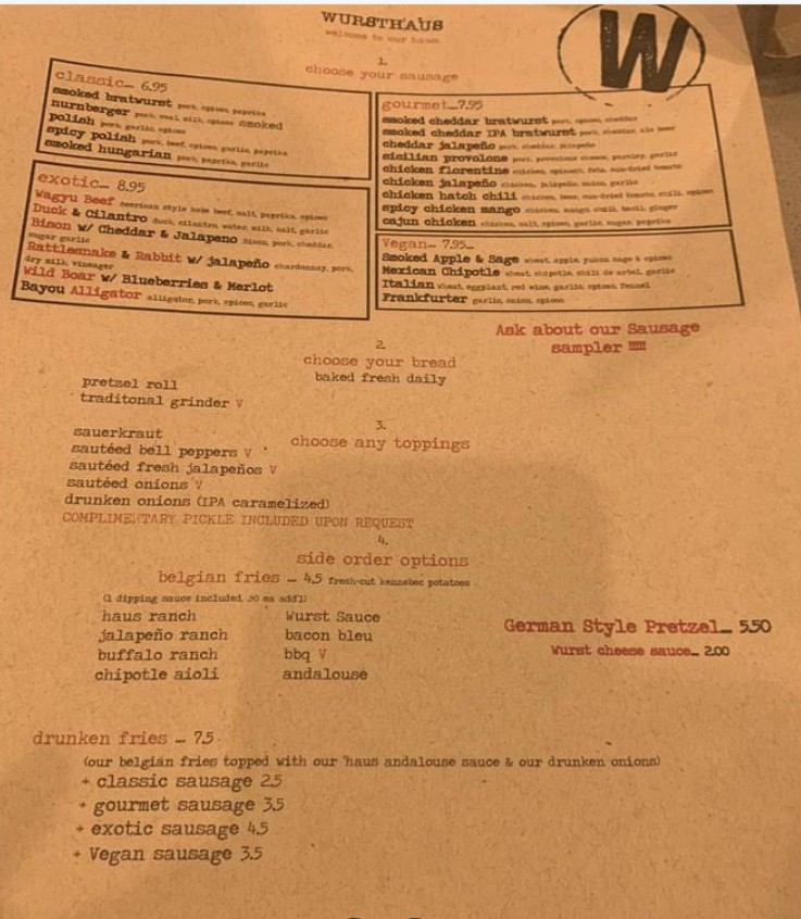 At Wursthaus Restaurant, we bring the authentic flavors of German and Belgian cuisine to the heart of Santa Ana. Whether you're craving a classic sausage or a gourmet twist, our carefully curated menu features a variety of sausages, fries, and other hearty dishes that pair perfectly with imported German and Belgian beers. Come and enjoy the best of beer hall dining in a modern setting with great company, great food, and even better drinks. Explore our menu and indulge in the ultimate culinary experience today!